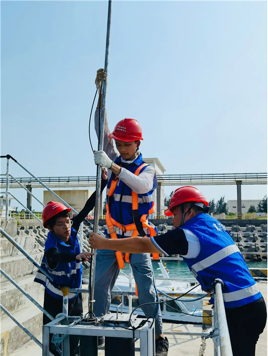 南海预报减灾中心外业人员在汕尾红海湾码头对海洋观测系统进行维护