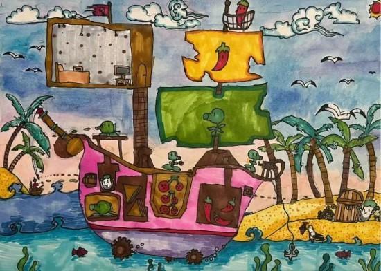 爸爸变英雄:还有位小朋友把爸爸出海工作的场景,想象成了一场酷炫的“战斗”——海洋工作者变身“豌豆炮手”,在海上勇敢地大战“海怪”!