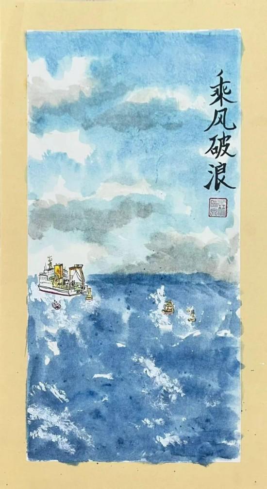 科考船真帅:有小画家用水墨画的方式,展现了“向阳红31”船在大海上布放浮标的场景。简单的笔墨,却画出了大海的辽阔和科考工作的不易,也画出了对爸爸妈妈工作的自豪。