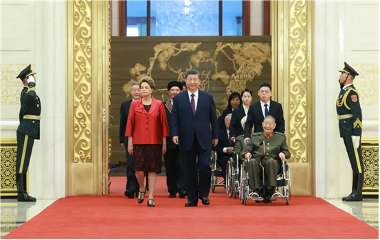 9月29日,中华人民共和国国家勋章和国家荣誉称号颁授仪式在北京人民大会堂金色大厅隆重举行。习近平同国家勋章和国家荣誉称号获得者一同步入会场。新华社记者 王晔 摄