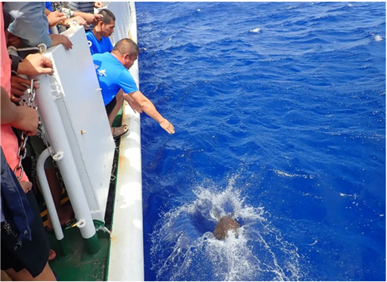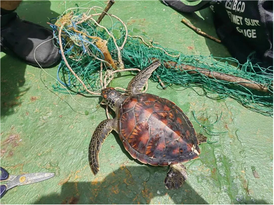 条件艰苦的作业现场,也发生过不少暖心的故事。一次航次任务中,队员在甲板上散步时突然发现水面漂来一团渔网,里面缠着一只小海龟。大家立刻拿来剪刀将渔网剪断,经过几个人的共同努力,受困多时的小海龟终于被成功解救,回归大海的怀抱。2021年,正在海上执行任务的涠洲海洋站调查团队再次发现海中废弃的渔网里有一只被困的海龟。调查队员立即把渔网和海龟拉到了甲板上剪断渔网,将海龟解救出来,这次被解救的海龟龟甲长约50厘米。放归大海后,看着海龟畅游在湛蓝的水中,大家欢呼了起来。