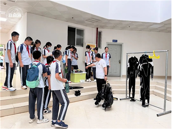 何志江为走进北部湾海洋生物标本馆的学生讲解潜水设备