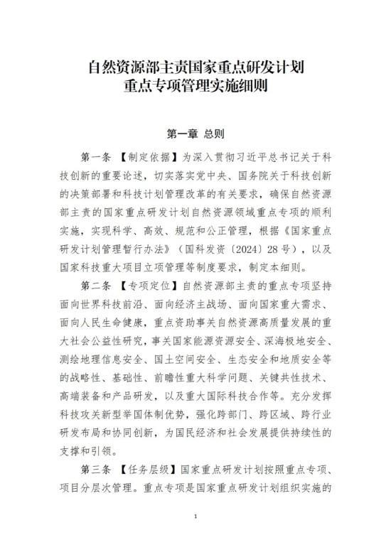 为规范自然资源部主责国家重点研发计划重点专项管理,保障专项组织实施,根据党中央、国务院关于科技计划管理改革的有关要求,按照科技部、财政部《国家重点研发计划管理暂行办法》(国科发资〔2024〕28号),现将《自然资源部主责国家重点研发计划重点专项管理实施细则》印发给你们,请遵照执行。