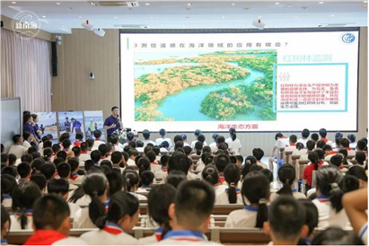 黎远金博士从测绘遥感的角度,为同学们带来《遥远的感知:测绘遥感在海洋领域的应用》科普课堂。黎博士主要从事遥感图像处理、植被定量遥感、海岸带生态遥感等相关工作。他向同学们讲述了什么是测绘、标准地图长什么样、测绘成果怎么得来、守护地球的“千里眼”——遥感究竟是什么等,更是从海洋灾害、海域海岛、海洋生态、海洋环境等方面介绍了测绘遥感在各个海洋领域的应用。最后,黎博士还向同学们提出“尽量少用一次性塑料制品、积极参与海滩或水域的垃圾清理活动”等守护海洋生态的倡议。