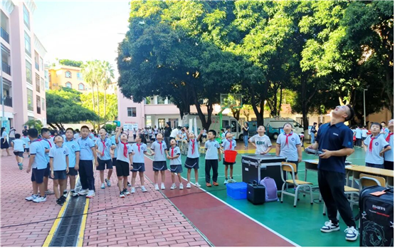 手持气象仪也吸引不少同学关注。低年级学生形容其外形“像棒棒糖”,而高年级学生则提出“能否测台风?”“台风风速多少?”等问题,科普人员戎思敏老师借此延伸讲解海洋浮标和气象仪在台风观测中的实际应用。