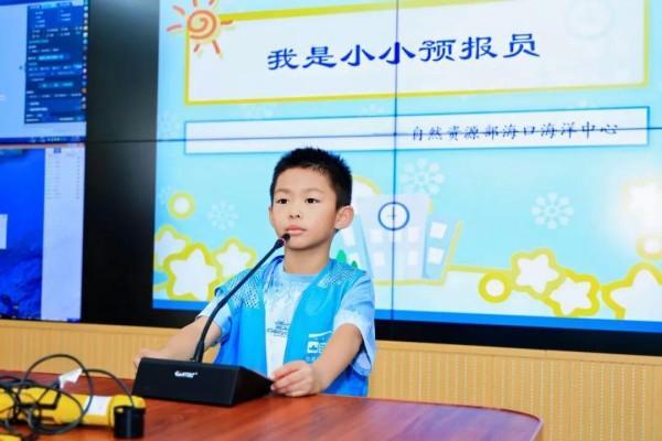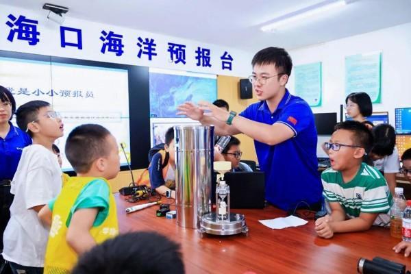 在海口海洋预报台,海口市第九小学的学生在工作人员的引导下,亲手操作海洋观测设备,了解海洋数据的采集与分析流程。他们化身“小小海洋预报员”,体验海况播报过程,在互动中理解海洋预报工作的重要性。一名学生兴奋地讲道:“工作人员分析云图和数据,就像医生诊断病情一样。原来大海也会‘发脾气’,需要‘海洋医生’来诊断,真是太有趣了!”